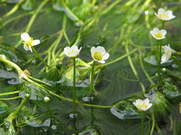 連日の雨で川も増水ぎみ。梅花藻は咲いているのですが、この状態のままでは見にくい。 |