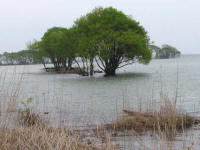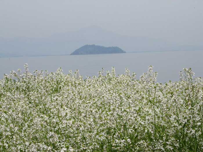 木々の新緑がきれいでした。こちら側からも竹生島をパチリ。 |