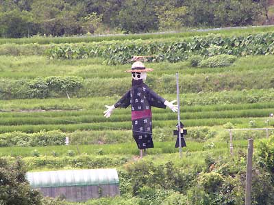広い棚田を見下ろすように、デッカイ案山子さんがいました!秋になれば、ユニークな案山子がいっぱい並びます。 |