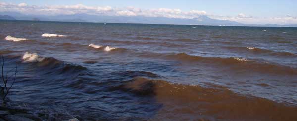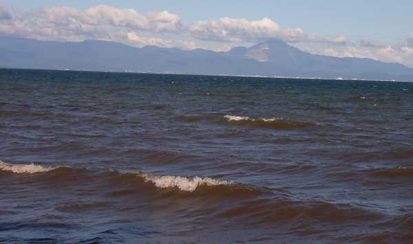 | 右の尖がった山が伊吹山、左の方には竹生島も見えます。 |