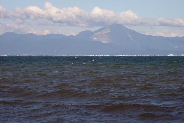 対岸の連なる山々を眺めていると、見覚えのある美しい山を発見。
